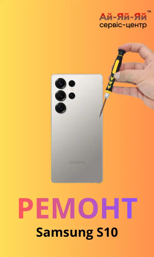 Ремонт Samsung S10 і ціни на нього зафіксовані на сайті сервіс-центру Ай-Яй-Яй. Ми стежимо за ціноутворенням на цю послугу в Києві та намагаємося пропонувати ремонт Самсунг S10 за вигідною ціною не лише в столиці, а й по всій Україні, оскільки наш сервіс-центр Apple приймає техніку з різних міст через доставку компанією Нова Пошта. Залежно від типу несправності ремонт Samsung S10 може включати заміну скла, дисплея, акумулятора, роз’єму зарядки, відновлення після потрапляння вологи, профілактику або перепрошивку. Точна вартість робіт визначається після діагностики смартфона та перевірки його технічного стану.Заміна скла на Samsung S10. Чим відрізняється від заміни дисплея? Основні дані